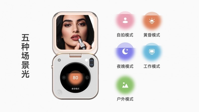 在功能方面,小紫镜【鎏金映颜】更是亮点纷呈。它拥有五种场景光模式,分别为自拍、户外、工作、黄昏、夜晚模式,且亮度可调节。不同场景下,使用者都能找到最适合的灯光进行化妆补光,轻松打造完美妆容。无论是在光线复杂的户外,还是灯光昏暗的夜晚,都能如同在专业美妆灯下一般,精准把控妆容细节。