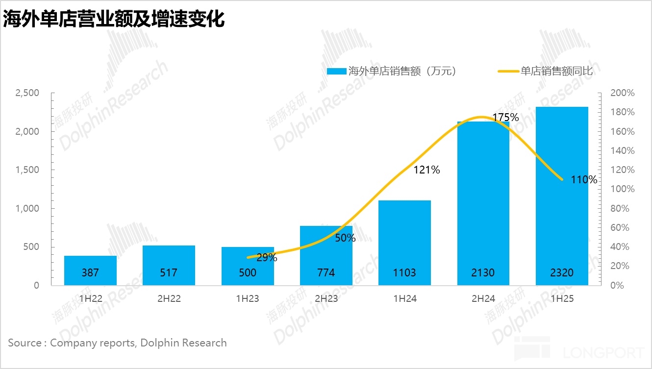 由于海外高速开店,因此从单店营业额角度增速环比去年下半年有所回落,实现单店营收 2320 万元,是国内的近 3 倍。
