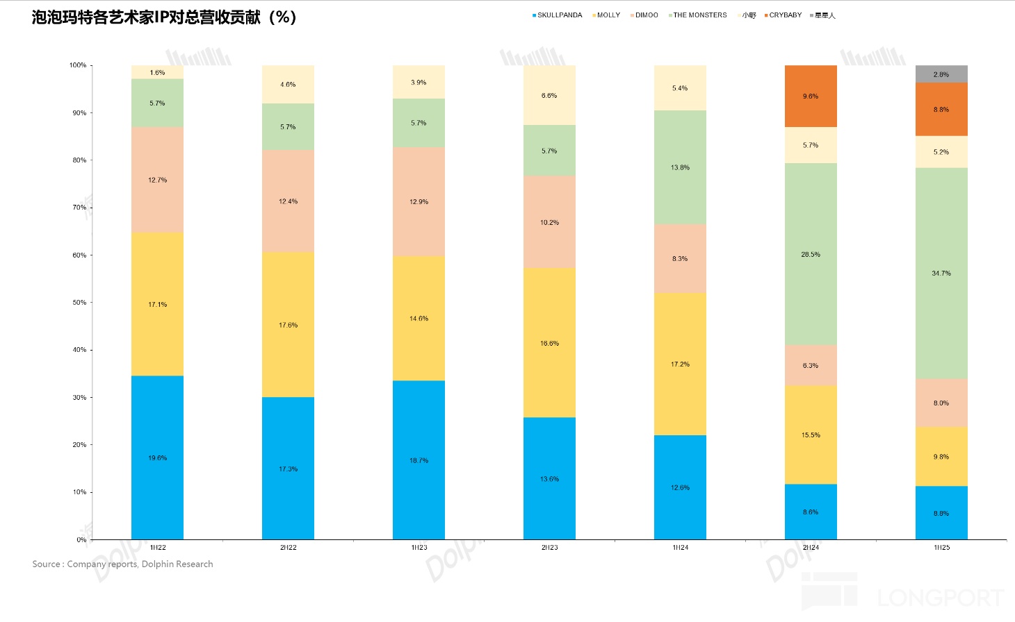 但实际上,从中报的情况来看,THE MONSTERS 系列的占比其实并没有市场预期那么高(预期在 40% 以上),一方面在于 Molly、SKULLPANDA 等经典 IP 通过形象的演变实际上拓宽了消费者边界,这一点通过对标三丽鸥也可以发现 IP 本身形象的迭代会不断吸引新人群延长 IP 自身的生命周期。另一方面,从去年下半年高速增长的 CRYBABY 再到今年上半年的星星人(二者合计当前贡献已超过 10%),可以看到不断有腰部 IP 站出来接力,这一点也是除了业绩自身外海豚君认为比较超预期的。
