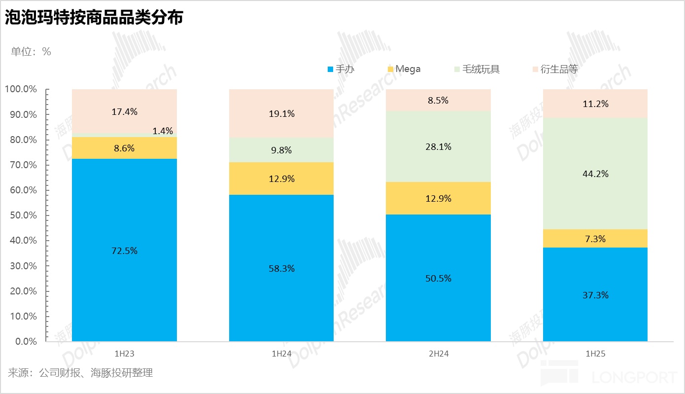 从产品品类上看,泡泡玛特以盲盒为代表的手办占比持续下降,取而代之的是毛利更高的毛绒玩具系列爆发式增长。除了 THE MONSTERS 系列销量激增外,可以看到公司旗下很多别的 IP 也逐步采用了毛绒玩具的设计,整体占比从去年同期不到 10% 飙升到 44%,成为第一顶梁柱。