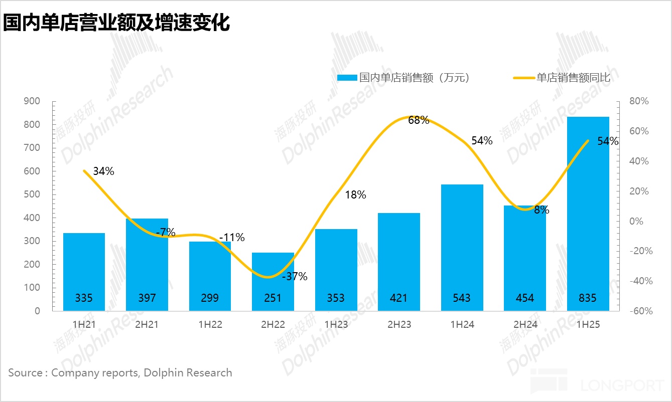 单店营业额上,国内伴随门店质量的升级叠加品类的拓张,海豚君测算上半年国内的平均单店收入达到 835 万元,同比增长 54%,无论是客流量还是客单价较去年同期均显著提升。
