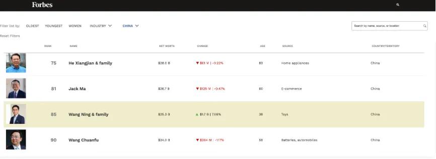 与此同时,目前王宁进入福布斯全球富豪榜前100排在85位,中国富豪第9,今日过后应该会排到第8名,仅排在钟睒睒、张一鸣、马化腾、黄峥、雷军、丁磊、何享健之后。