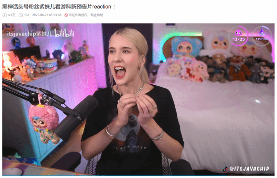 与此同时,一位海外女性游戏主播“itsjavachip紫蛛儿”也第一时间观看了黑神话:钟馗的最新预告,并录制了一段观看反应视频。视频中,她表现出极大的惊喜与期待,情绪高涨,对该作充满兴趣。相关视频可通过下方链接查看。