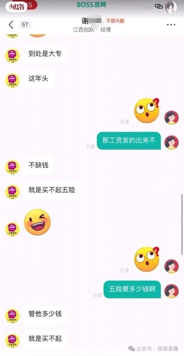 💰 HR言论引争议:在招聘过程中,涉事HR以“公司没钱交不了”、“到处是大专这年头”以及“买不起五险”等理由,对求职者关于五险一金的询问给出不当回复,直接引发了公众对企业用工规范和责任的质疑。