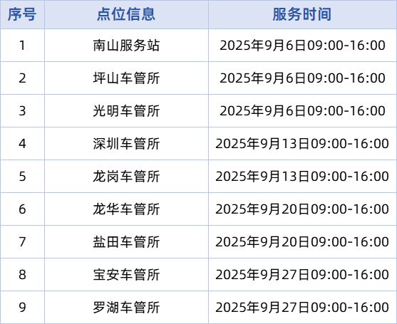 【导语】:2025年9月深圳车管所在本市东西片区分别设立“周六亲临办加窗服务点”,为亲临窗口办理本人相关业务的群众提供专门服务。
