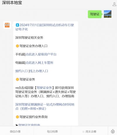 温馨提示:微信搜索公众号【深圳本地宝】,关注后在对话框回复【驾驶证】可获取深圳驾驶证业务预约及办理入口(补换领+转入)、车驾宝一体机地址&开放时间、体院医院名单、期满换证和补办指南、年审指南等信息。
