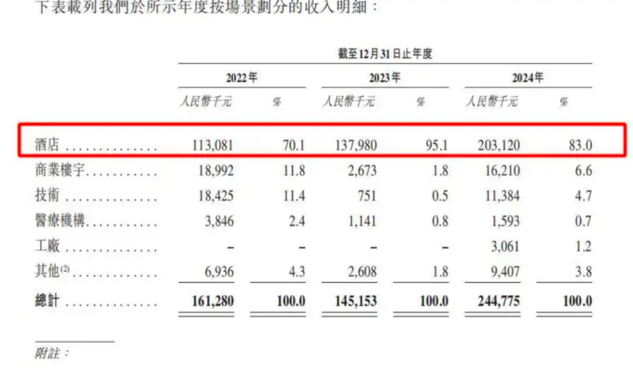 2022年至2024年,云迹科技的酒店场景收入占比分别为70.1%、95.1%和83.0%,2024年更是贡献了公司超八成的营收。