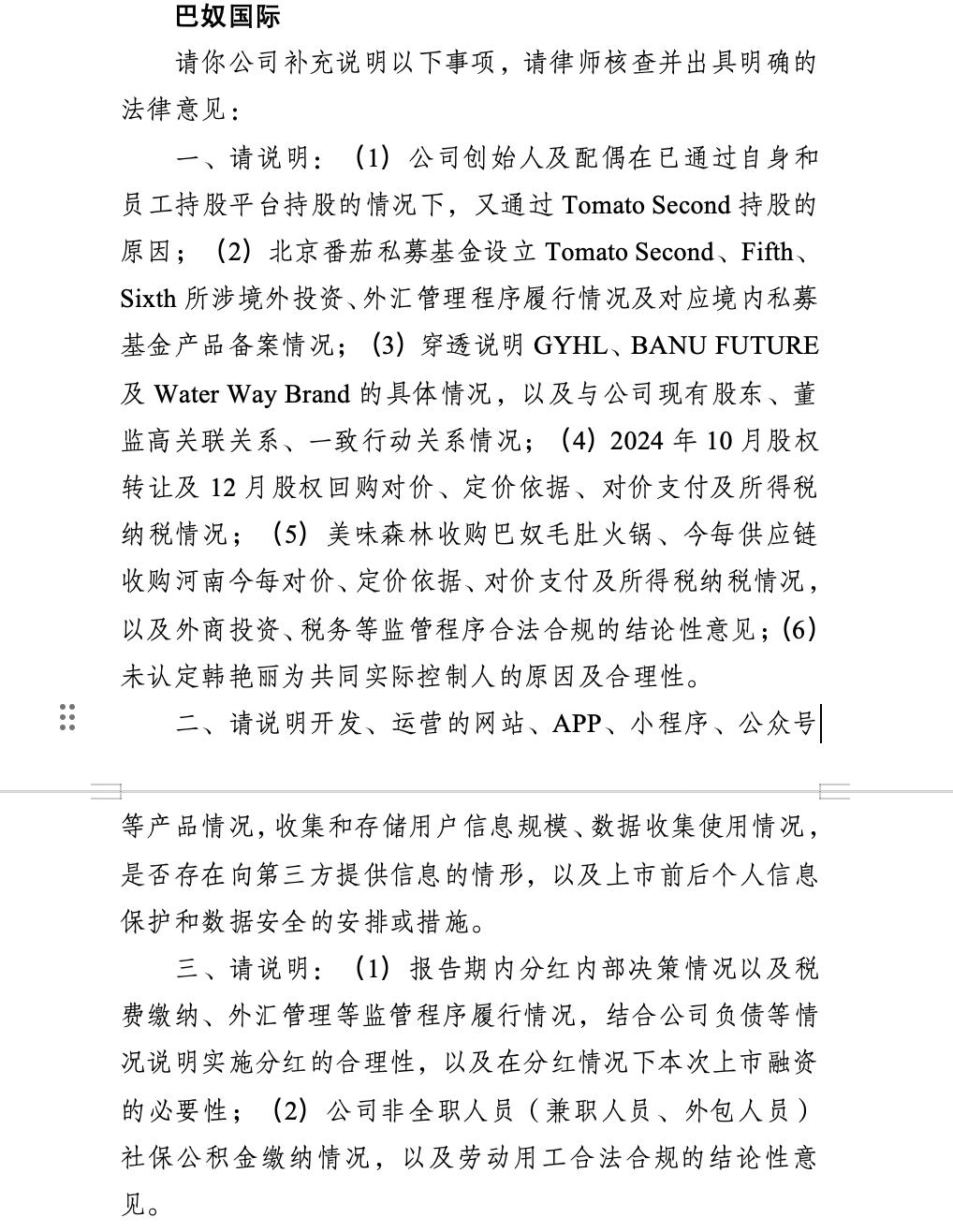 证监会要求巴奴说明:在杜中兵已通过自身及员工持股平台实施控制的情况下,为何还要通过番茄资本旗下境外主体Tomato Second等私募基金进行间接持股?