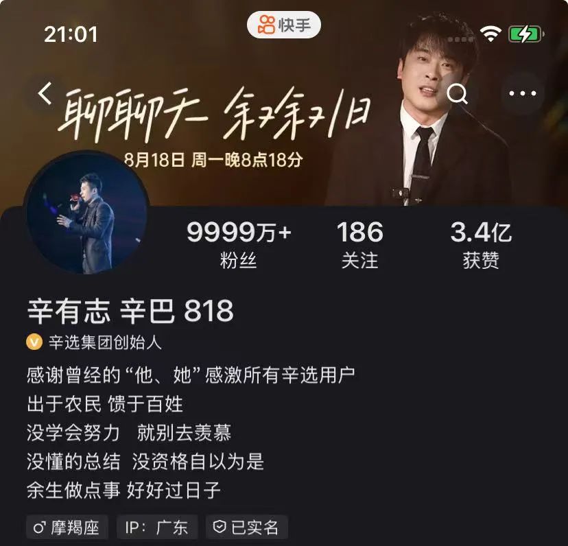 8月18日晚,快手主播辛巴在直播中表示,“跟大家做个告别,从今天开始辛巴再无能力承载直播这份工作,今天正式宣布退出直播行业。”辛巴在直播中表示他肺部出现了严重的疾病,需要好好调养自己的身体。同时他表示,接下来会把公司交由初瑞雪(其夫人)管理。