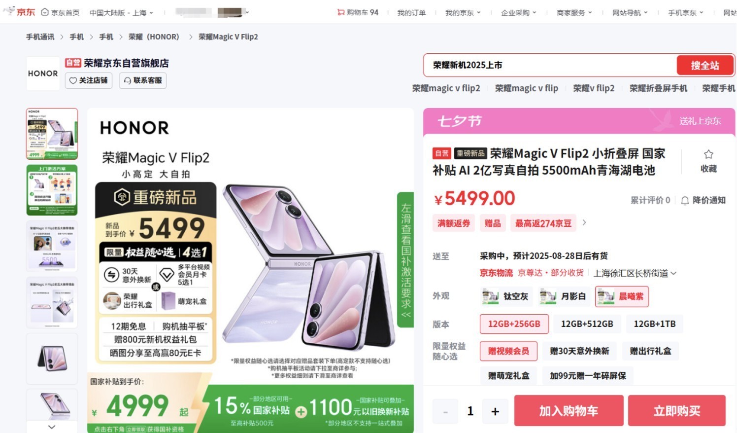 8月21日,荣耀Magic V Flip2正式发布,售价5499元起,将于8月28日10:08开售。为带给消费者更多权益,京东携手荣耀打造先人一步加速换新计划,提供限量800台荣耀Magic V Flip2高定款现货抢先发货。此外,来京东参与荣耀Magic V Flip2预售还可享权益随心选(高定款不参与),包括限量30天意外换新、限量多平台视频会员月卡5选1、限量萌宠礼盒、限量荣耀出行礼盒,四项权益可任选其一。目前,京东同步开启荣耀Magic V Flip2预售,享国补立减500元,到手价4999元起,参与预售还可享12期免息、购机抽平板、以旧换新至高补贴1100元、赠新机权益礼包、晒图分享至高赢80元E卡、加99元赠碎屏险(高定款不参与)等福利,参与荣耀Magic V Flip2高定款还可享限量赠JIMMY CHOO亲签明信片、赠JIMMY CHOO耀我女士香水40ml。