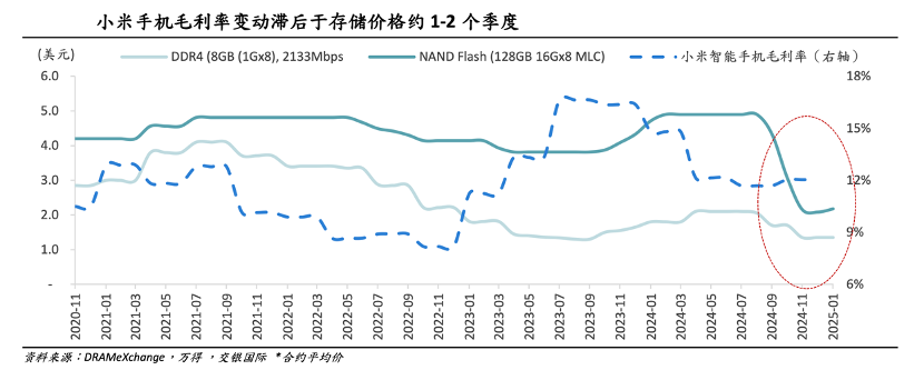 厂商押注AI手机固然多了卖点和噱头,但另一方面大模型手机亦会提高存储需求,手机的存储参数随成本开始飙升,在此背景下小米手机毛利率越发开始锚定存储价格。