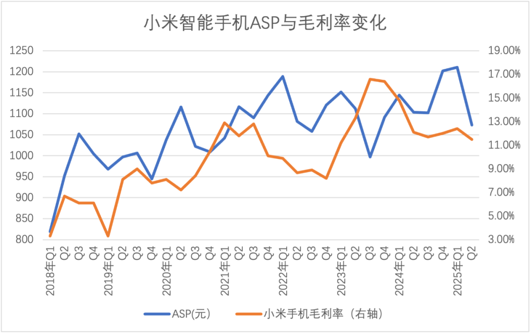 2025年Q2,小米手机毛利率和ASP呈现双双下行,尤其后者更是创了近年内新低,市场中开始弥漫着小米高端化受阻的声音。