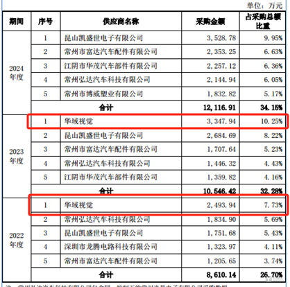 与此同时,2022-2023年,华域视觉还是通宝光电的第一大供应商,采购金额分别达2493.94万元、3347.94万元,占当期采购总额的7.73%、10.25%。这意味着,华域视觉长期身兼通宝光电“大客户”与“大供应商”的双重身份。
