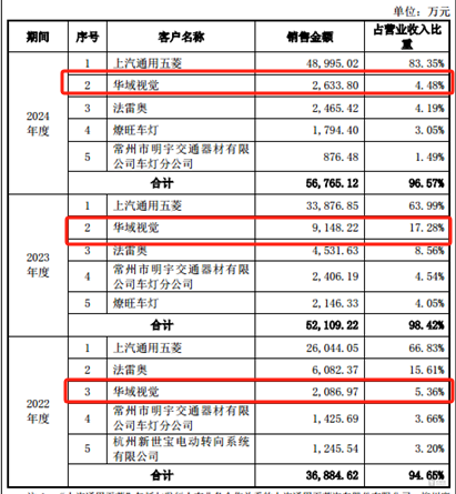 笔者注意到,通宝光电的业绩增长与上汽通用五菱的合作深度绑定,呈现出极强的客户依赖特征。报告期内,上汽通用五菱为通宝光电贡献的收入占比始终维持在60%以上,其中2024年这一比例更是飙升至83.35%,意味着公司超八成的营收直接依赖单一客户。