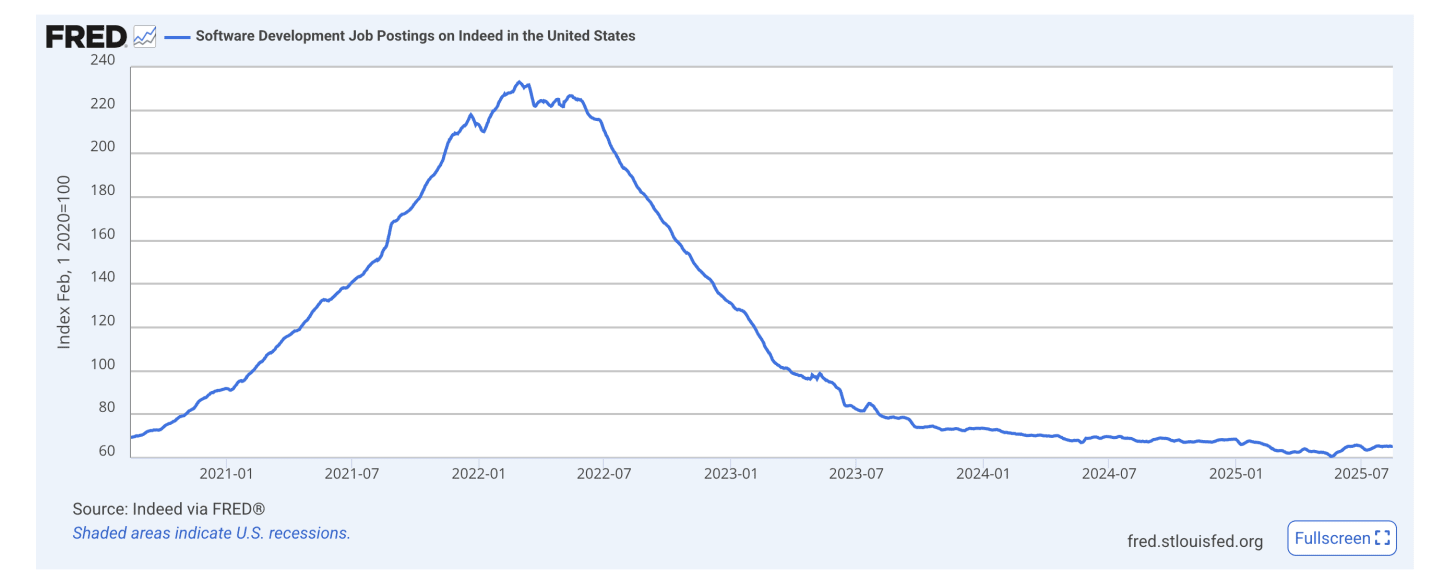 Right now, it seems hiring is at a post-COVID but pre-COVID boom hiring level. This means the jobs posted each day are equivalent to what was posted before COVID hiring caused the market to take off but after COVID itself caused a dip. At first, this doesn't seem terrible but the distribution of jobs is highly skewed in two ways: