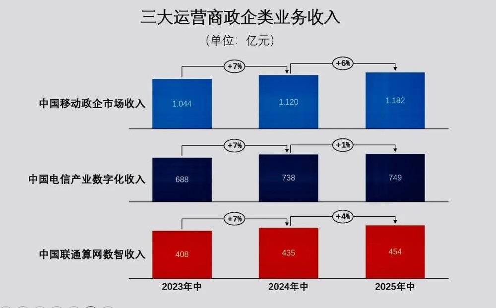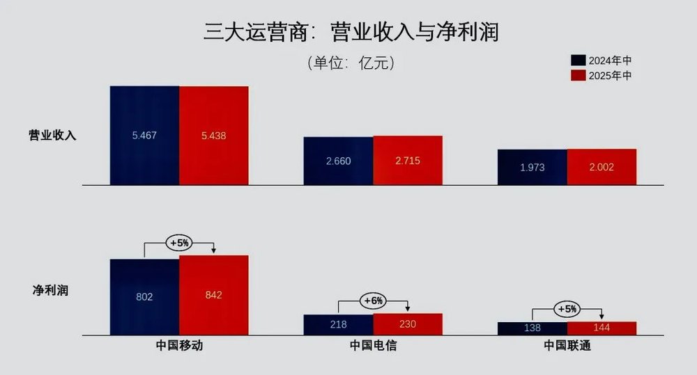 三大运营商相继发布2025年上半年经营业绩,虽然营收水平基本持平,但净利润都实现了5%以上的同比增长,于是又有媒体用“日赚数亿”为标题来渲染其盈利能力。