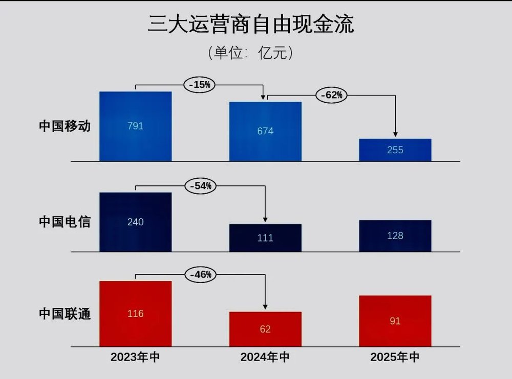 特别是中国移动2025年中的255亿自由现金流,虽然在三家之中仍最为雄厚,但同比竟然减少了62%,几乎只有2023年同期的1/3;而中国电信和中国联通2025年中的自由现金流虽然同比有所增长,但与2023年同期相比仍然大幅下滑。