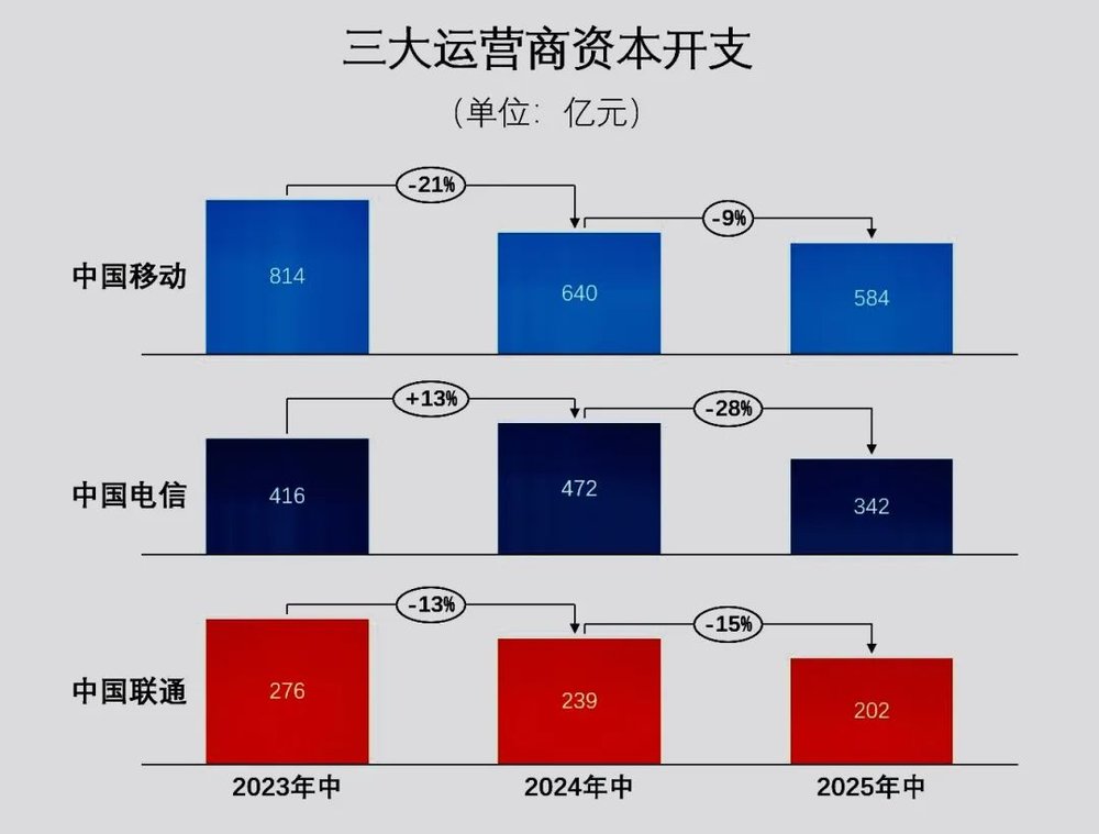 在经历过2020-2023年的5G投资高峰之后,随着5G网络覆盖率的逐步完善,三大运营商开始逐年减少资本开支,中国移动、中国电信和中国联通在2025年上半年的资本开支同比分别下降了9%,28%和15%,这对于三大运营商的自由现金流产生的是正向影响。