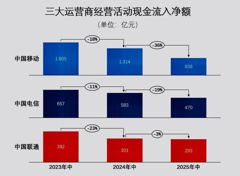 三大运营商2025年上半年自由现金流在资本开支下调的情况下仍表现不佳,则问题显然就出在经营活动产生的现金流上。