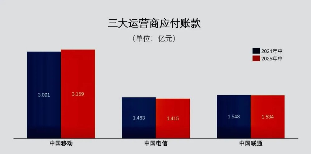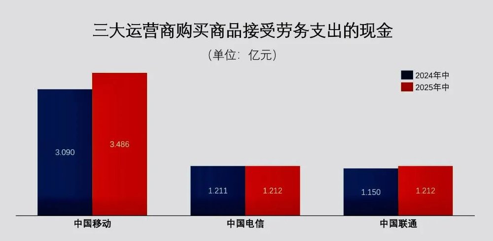 但分析三大运营商半年报中向供应商“购买商品、接受劳务支付的现金”数据,从下图可以看到,除中国移动同比增加了396亿外,中国电信和中国联通对供应商支付的现金在2025年上半年并未有显著变化。