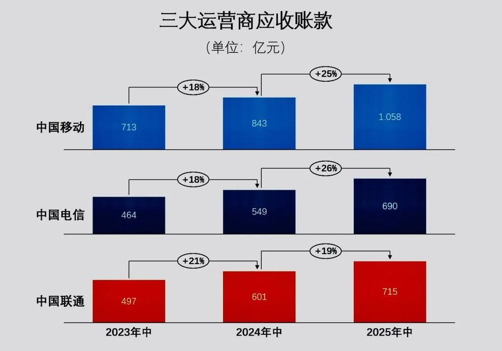 从下图可以看到,2025年上半年,中国移动、中国电信、中国联通的应收账款分别同比增加了25%、26%和19%。