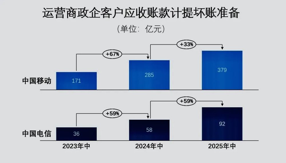 从下图可以看到,中国移动和中国电信针对政企客户组合计提的坏账准备分别在2024年中增长了67%和59%,在2025年中增长了33%和59%。