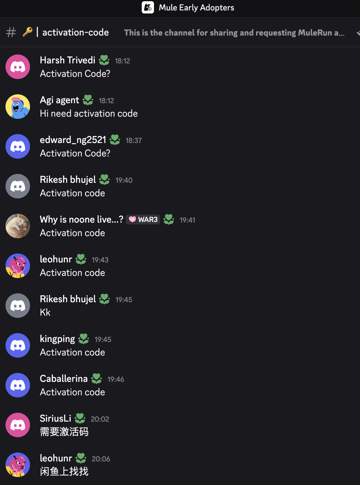 MuleRun 目前还是采用邀请码机制,Discord 排队才能拿到