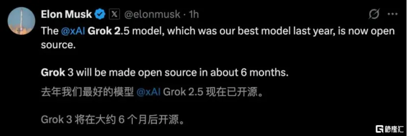 8月24日,马斯克在X上官宣:开源xAI去年最好的Grok-2模型,约六个月后拟开源Grok 3模型。