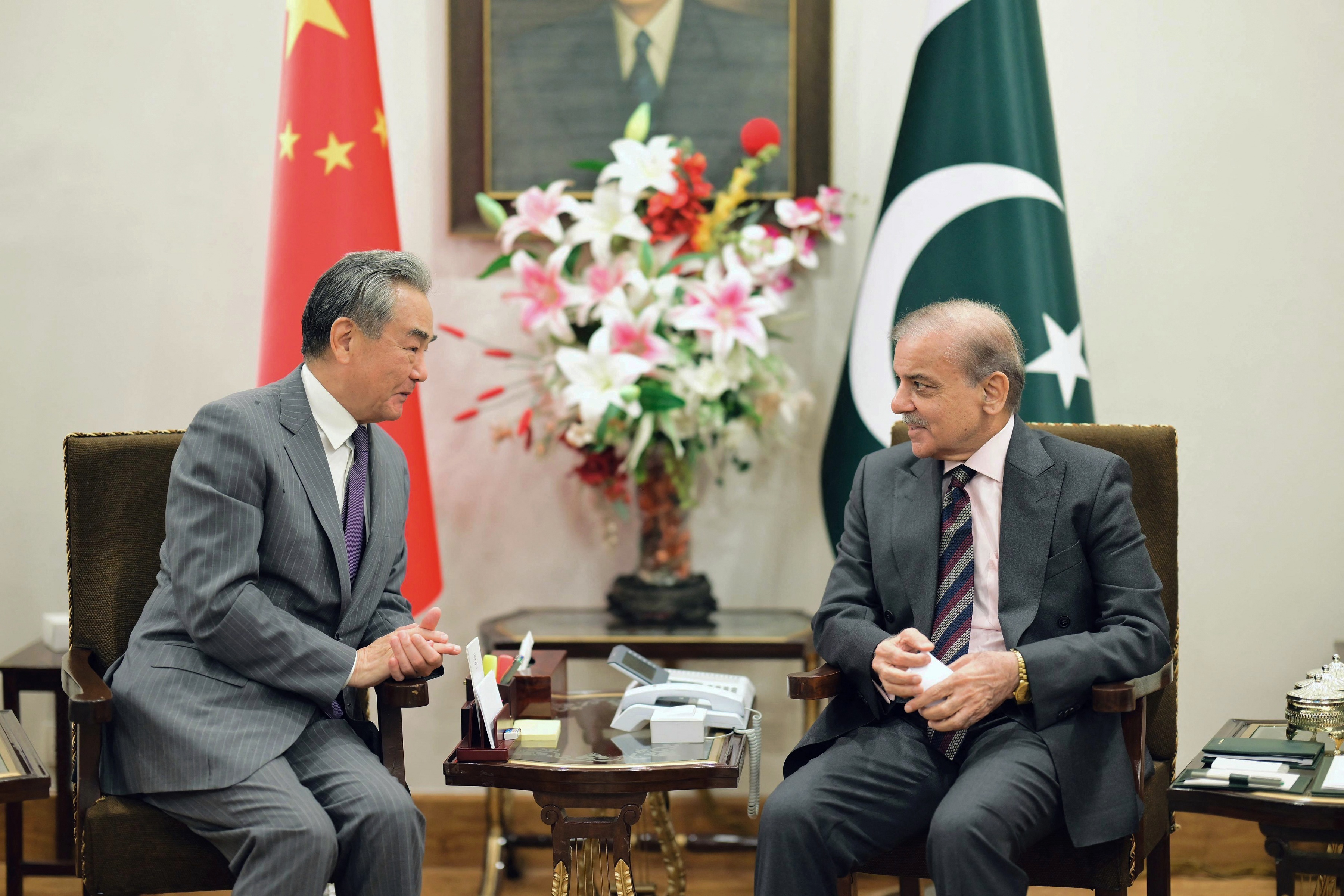巴基斯坦总理 Shehbaz Sharif 会见中国外交部长王毅,伊斯兰堡。8月21日,中国外长王毅赴伊斯兰堡出席第六次中巴外长战略对话,并与巴基斯坦总理就中巴关系、经贸合作以及共同关心的国际地区问题举行会谈。王毅强调中方始终是巴方最可靠的伙伴、最坚强的后盾,双方要加快推动中巴经济走廊「2.0升级版」建设,加强农业、工业、矿业三大领域合作。巴基斯坦总理 Shehbaz 表示十分期待赴华出席上海合作组织天津峰会和纪念中国人民抗日战争胜利80周年活动。中国连续10年为巴基斯坦最大贸易伙伴,2025年1至7月两国双边贸易额达145.04亿美元,同比增长11.5%。摄影师:Pakistan Prime Minister's Office