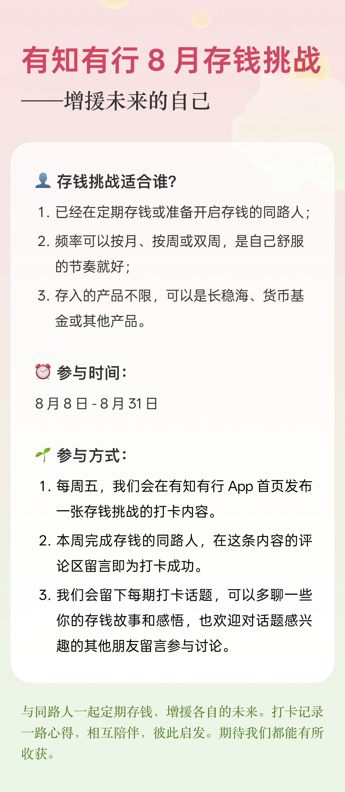 有知有行 8 月存钱挑战正在进行中,如果你愿意,不妨和我们一起行动起来。
