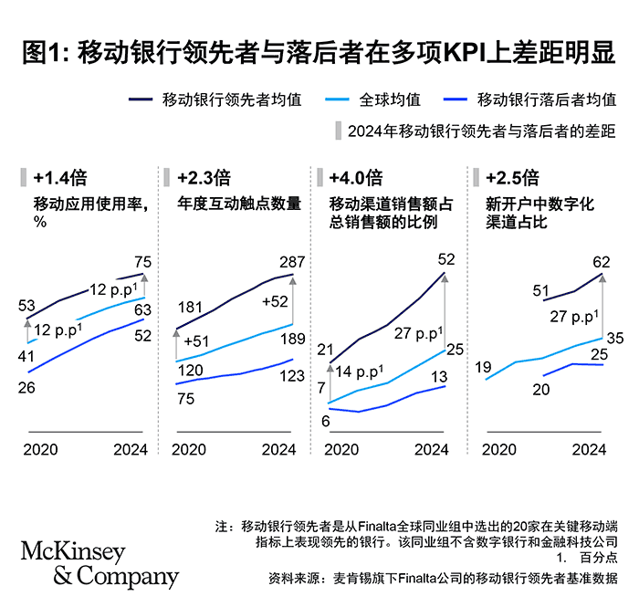 消费者对此反响积极。在移动创新方面领先的银行,往往拥有更高的客户黏性、更频繁的交互行为,商业回报也更为可观。麦肯锡旗下研究机构 Finalta 的基准数据显示,移动银行领跑者通过简化用户路径,已能在应用内解决超过八成的日常事务。这些银行在移动端的年均交互频次比全球平均水平高出51%,由移动端驱动的销售与获客表现更是全球平均水平的近两倍(见图)。