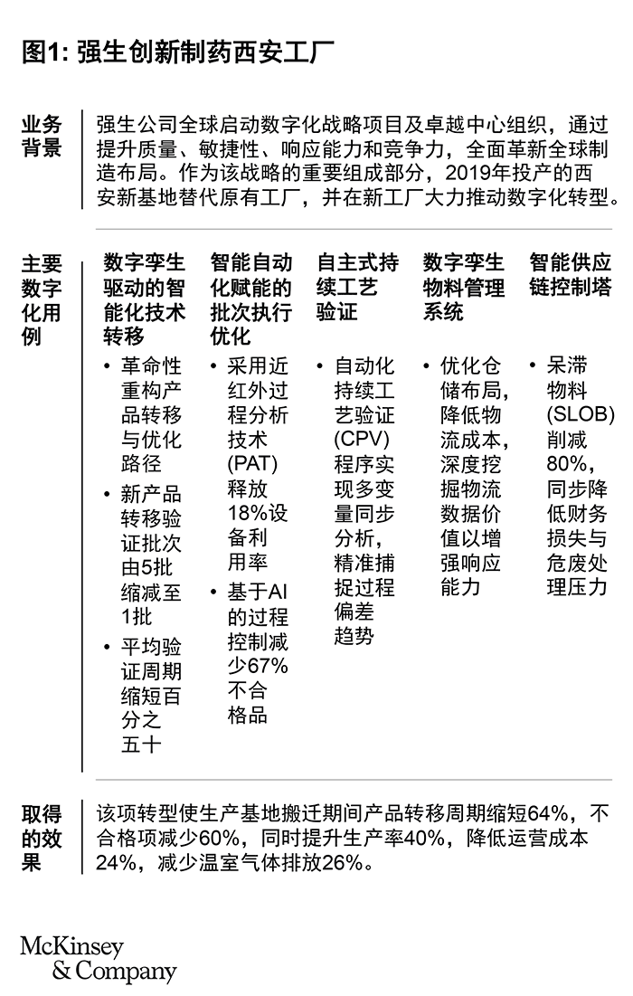 这座新工厂为药企快速完成技术转移、新厂认证和产能爬坡提供了坚实例证。强生制药西安新工厂采用了用于技术转移和物料处理的数字孪生技术,实现了持续工艺验证和批次执行流程的智能自动化。这些举措带来了显著的效果:在厂址搬迁期间,该工厂产品转移时间缩短64%,不合格产品减少60%,同时生产率提高40%,运营成本降低24%;值得一提的是,在环境影响方面,该工厂减少了47%的材料浪费,温室气体排放减少了26%,能耗下降23%(见图1)。