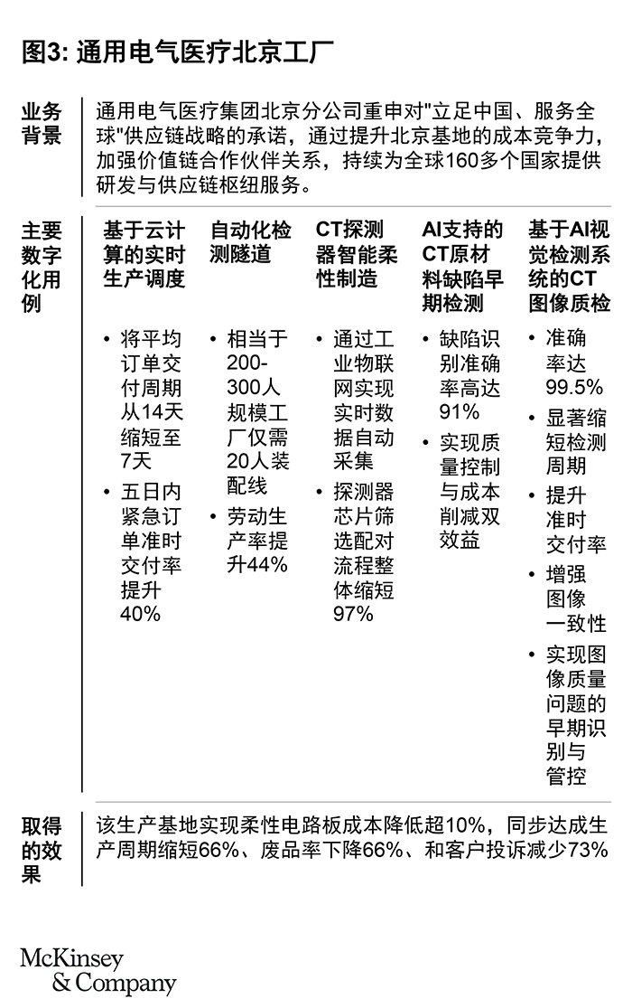 为此,通用电气医疗北京工厂通过在26条生产线上部署45个数字化解决方案,成功应对了复杂的制造和质量要求挑战。该基地运用人工智能进行缺陷检测和深度学习,将生产周期缩短了66%,废品率降低66%,客户投诉减少73%。此外,通过开发基于云计算的实时生产调度系统,紧急订单的准时发货率提高了40%(见图3)。