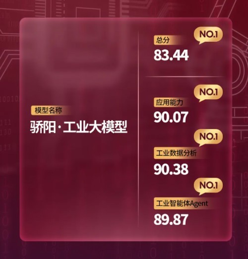 值得一提的是,在国内权威第三方评测机构SuperCLUE发布的中文原生工业大模型测评基准SC-Industry(SuperCLUE-Industry)最新榜单中,北电数智最新自研的骄阳·工业大模型以83.44的总分综合排名第一。