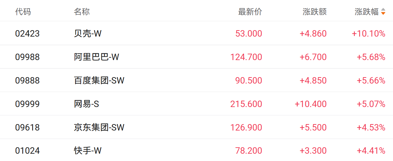 财联社8月25日讯(编辑 胡家荣)受益于市场多重利好,港股科技股走强。截至发稿,阿里巴巴SW(09988.HK)涨5.68%、百度集团-SW(09888.HK)涨5.66%、网易-S(09999.HK)涨5.07%、京东集团-SW(09618.HK)涨4.53%。