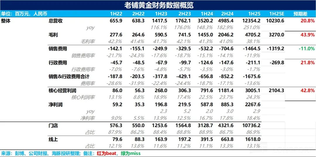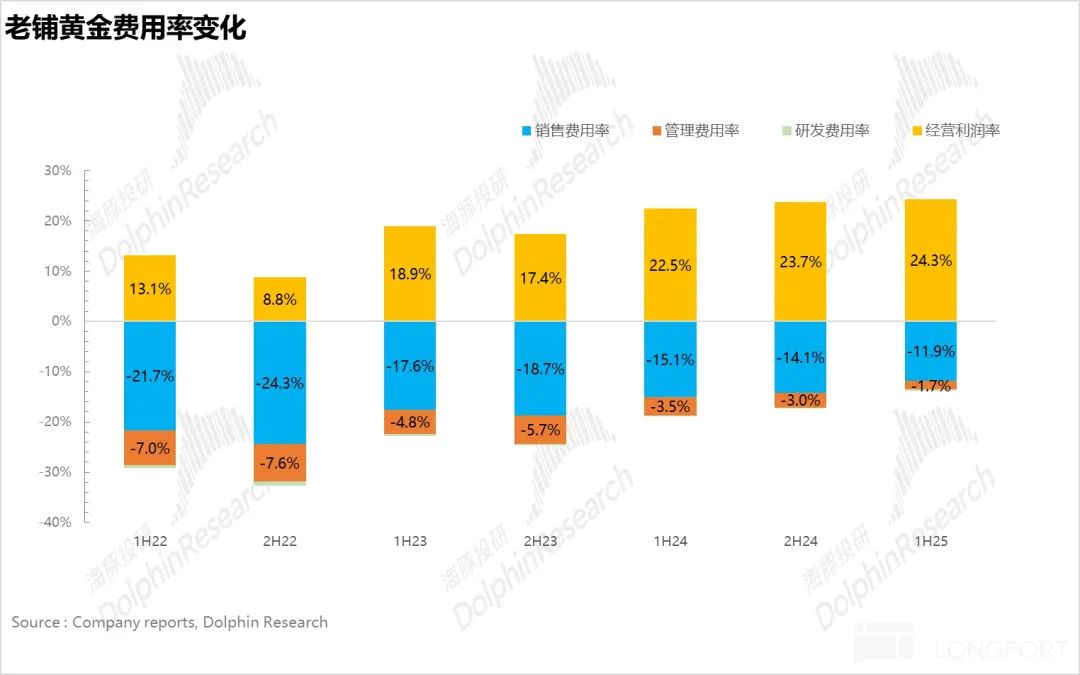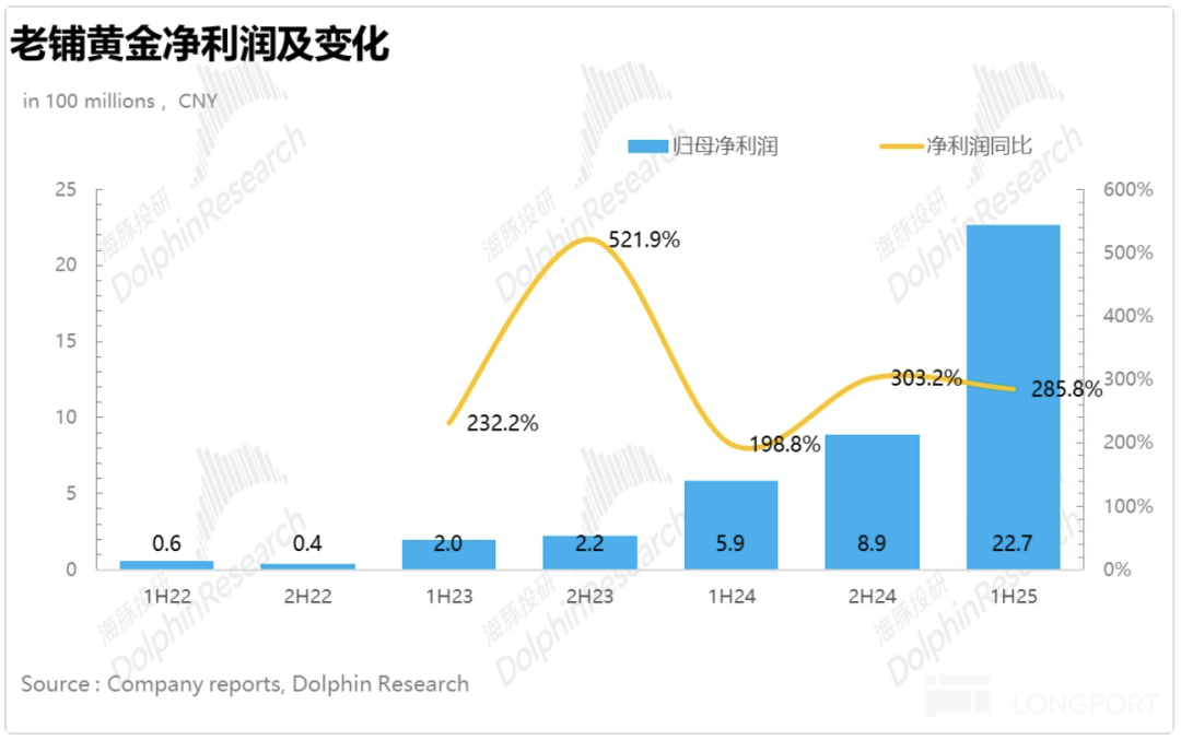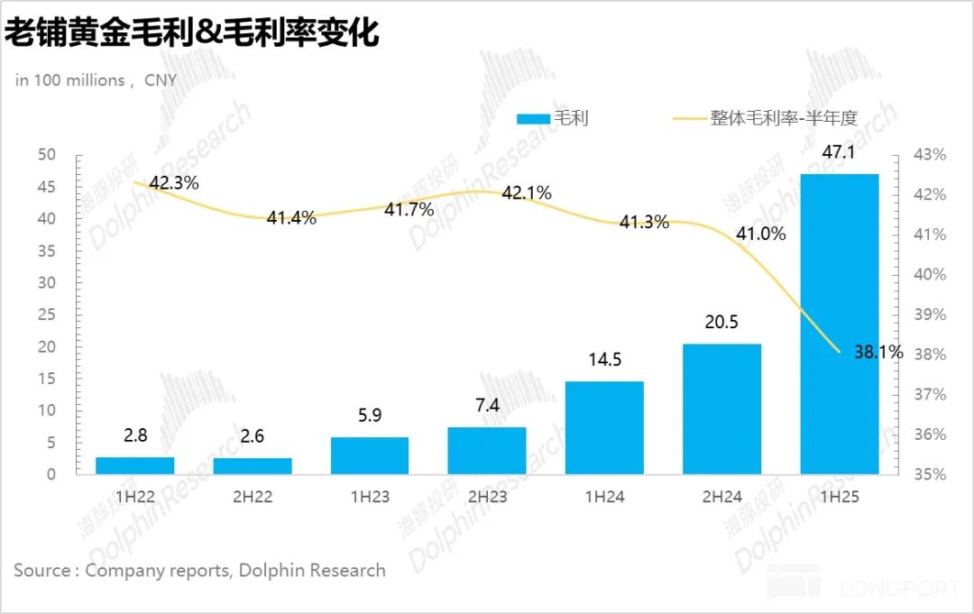 利润上,虽然上半年金价大幅上涨导致老铺原材料成本显著提升导致毛利率有所下滑,但在经营杠杆的释放下整体利润快于营收端的增长,实现归母净利润 22.7 亿元,同比增长 286%。