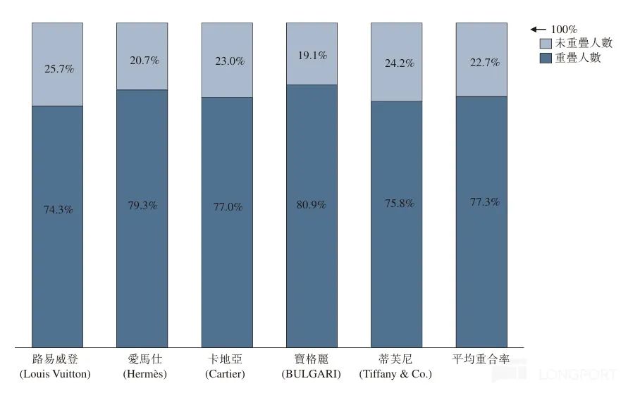 根据老铺自己的公告披露,从下图可以看到公司目前的消费者和国际奢侈品品牌的重合度已经接近 80%。