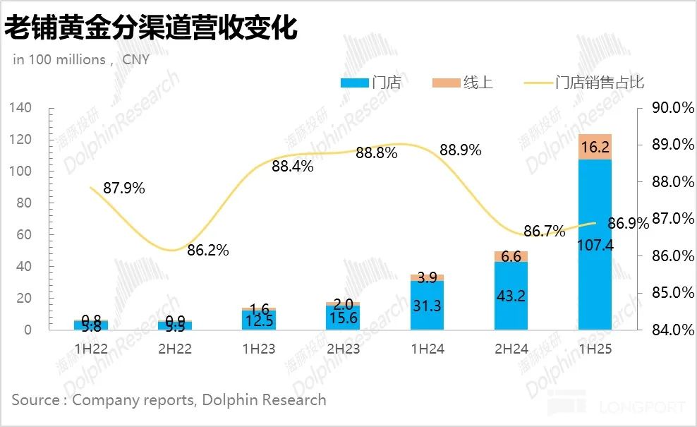 从渠道上看,随着上半年老铺在社媒的持续推广和发酵,线下门店的稀缺性和溢出效应使得老铺在天猫等线上平台表现亮眼,线上实现营收 16.2 亿元,占比小幅提升 2pct 达到 13.1%。但线下依然是老铺的主战场。