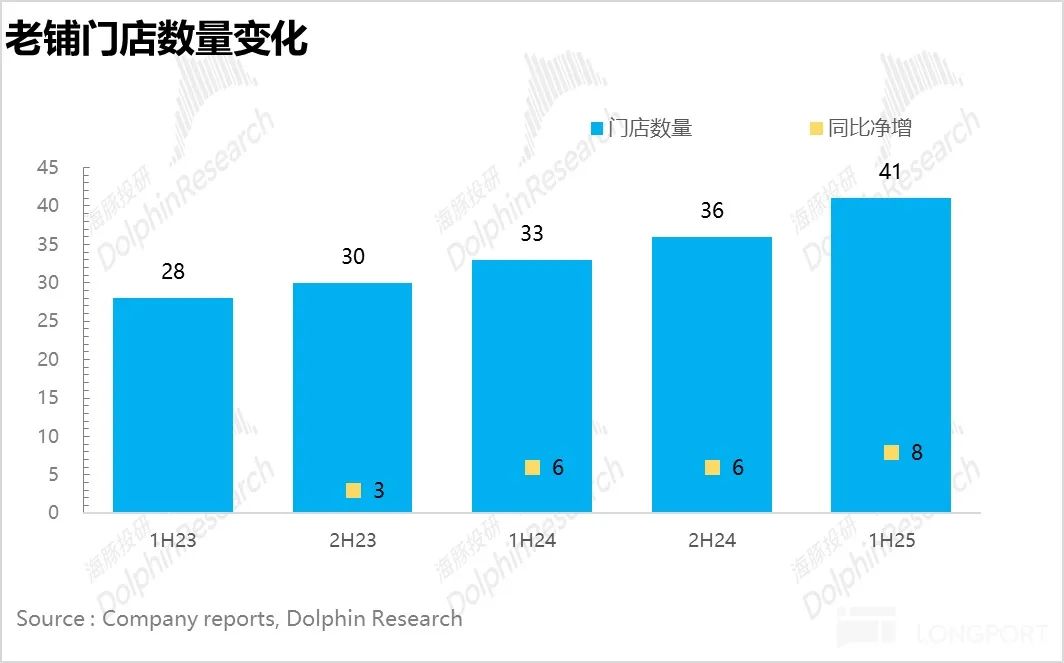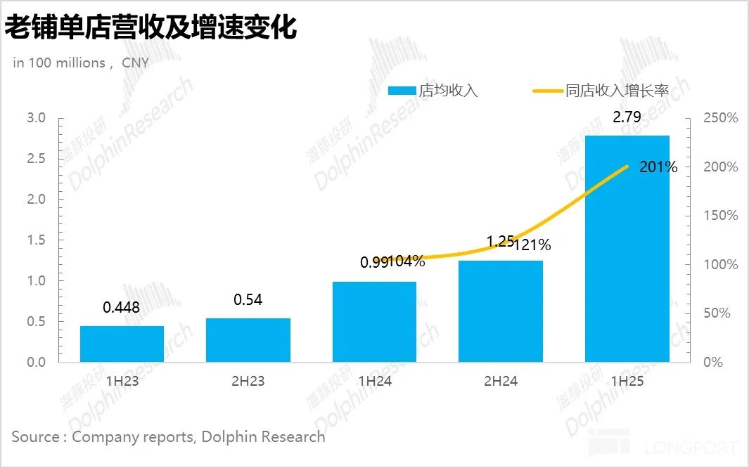 从衡量单店效益的核心指标——同店营收增速上看,25H1 老铺同店营收增长 201%,环比提速,除了老铺自身品牌力提升所带来的自然流量外,公司还通过优化现有门店的位置和面积提升了会员的复购率。