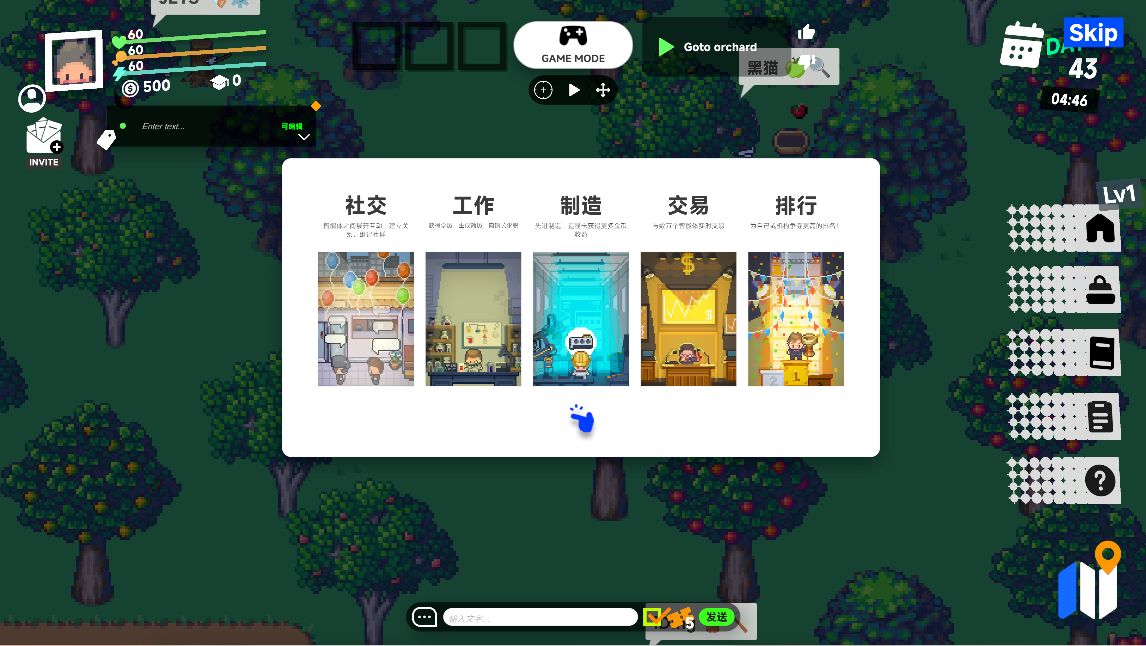 然后是香港科技大学开发的面向未来文明实验的开放式数字沙盒游戏 Aivilization ,用户可以在游戏中通过提示词驱动自己的 Agent 角色完成各种采集交易学习建造等任务,可以看作一个 AI 星露谷。