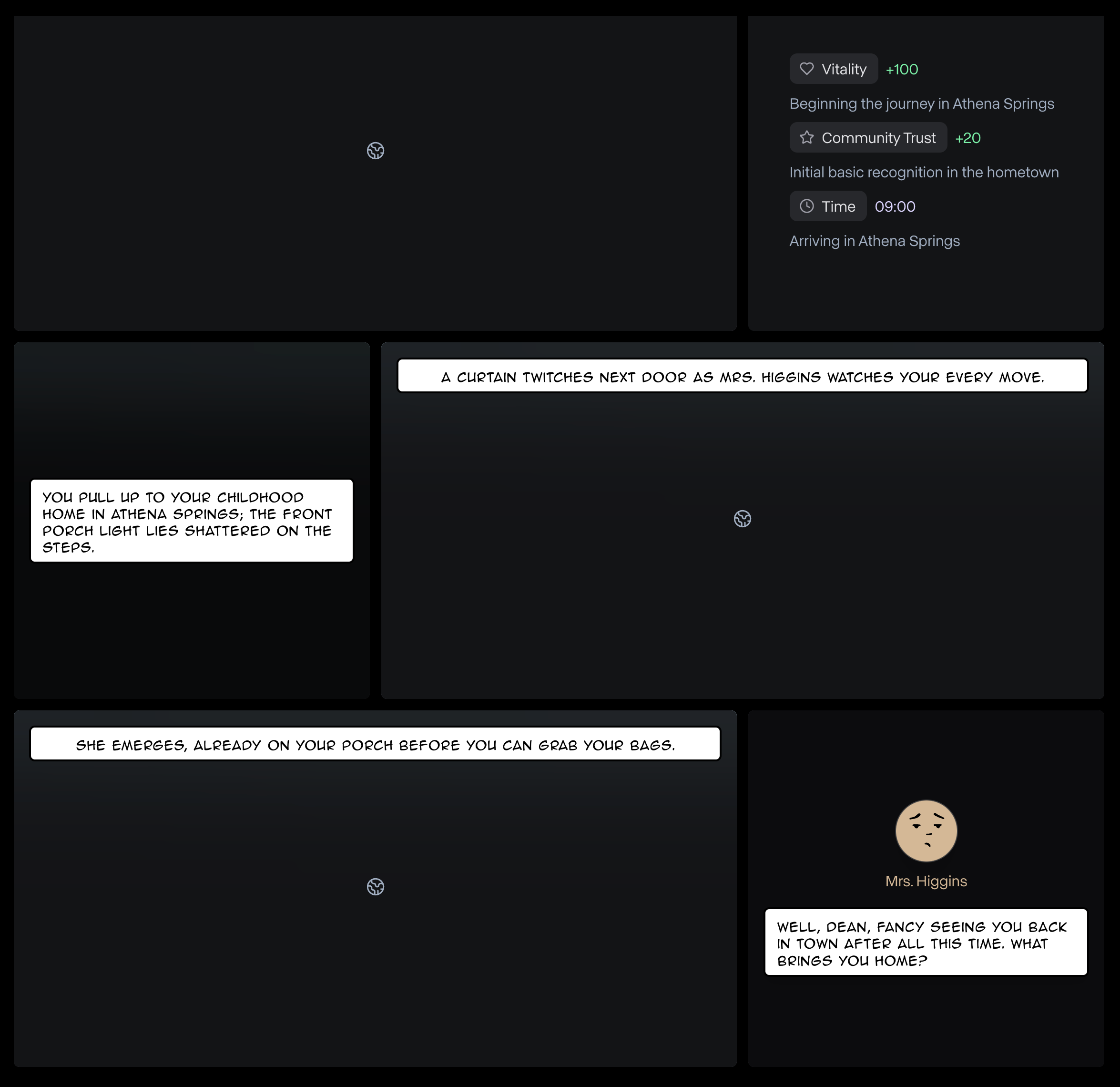 内容上用实时生成的图文内容表现游戏内容,UI 排版很像漫画,为了搞定文字生成的问题,文字是用 UI 展示在图像上的。
