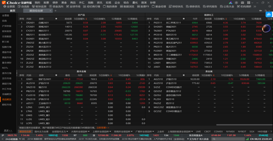 从Choice金融终端期货综合屏数据来看,上周商品市场各板块表现不一。农产品板块中,豆粕、白糖等品种震荡整理,涨跌互现;基本金属板块整体偏弱运行,镍、螺纹钢周内小幅收跌;贵金属板块中,沪银维持高位震荡格局。相比之下,能源化工板块内部分化明显,其中PX、烧碱、PTA涨幅居前,成为市场关注焦点。