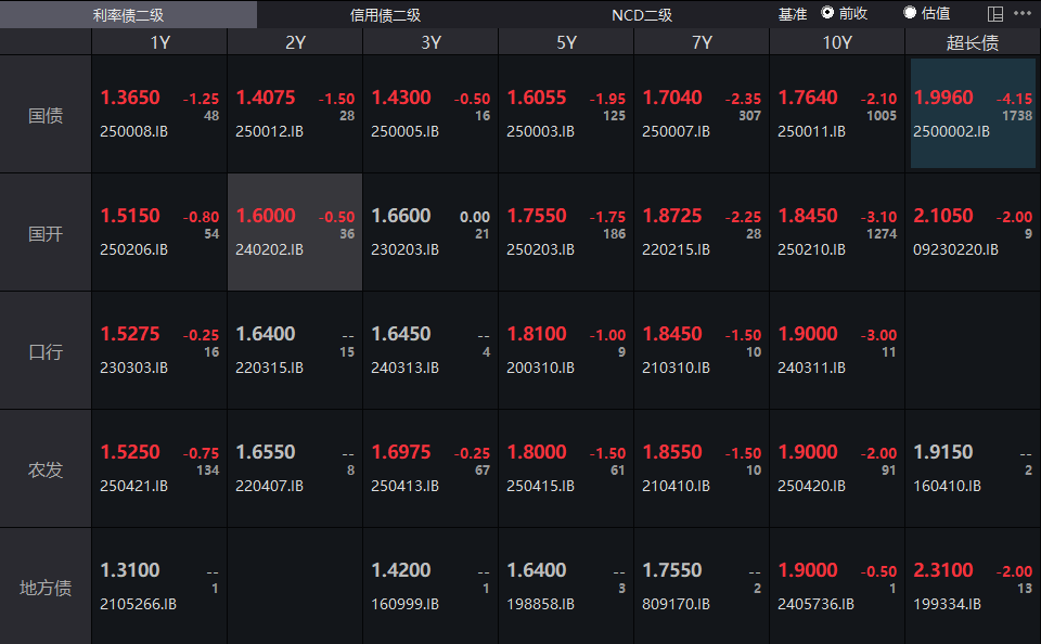 银行间主要利率债收益率全线下行,截至下午16:30,10年期国债活跃券250011收益率下行2.1bp报1.764%,30年期国债活跃券2500002收益率下行4.15bp报1.996%,10年期国开活跃券250210收益率下行3.1bp报1.845%。