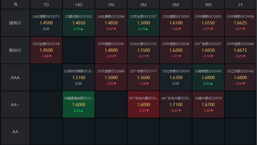存单方面,今日3M期国股在1.57%位置需求较好,1Y期国股报在1.65%的位置,较前一交易日下行0.33bp。二级存单方面,3M国股成交在1.50%附近,较前一交易日上行0.19bp,1Y国股成交在1.6625%位置,较前一交易日下行0.75bp。