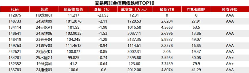 据Choice 数据统计显示,今日交易所市场非金信用债跌幅排行前五的分别是:H9龙控01、24深铁09、24天屹V1、24深铁06、23长开04。具体如下: