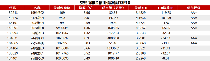 据Choice 数据统计显示,今日交易所市场非金信用债涨幅排行前五的分别是:19柯桥02、21万科04、20龙湖04、20万科08、25青资03。具体如下: