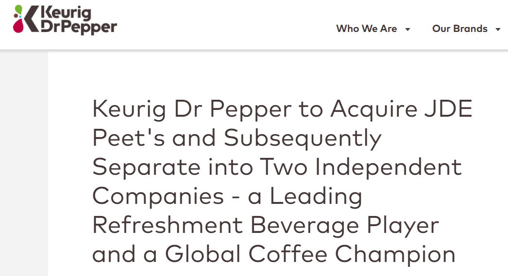 Keurig Dr Pepper在新闻稿中表示,收购JDE Peet's将显著提升自身的咖啡定位,可借此打造一个强大的、有韧性的且多元化的全球产品组合。