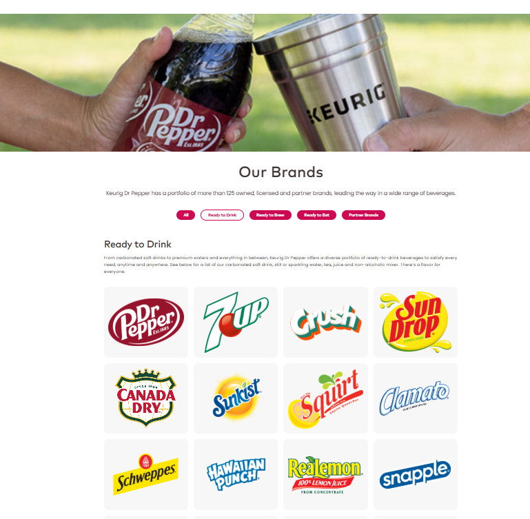 Keurig Dr Pepper是由Keurig Green Mountain于2018年收购Dr Pepper Snapple Group合并而来,前者由Green Mountain(绿山咖啡)并购咖啡机公司Keurig而成,后者由Dr Pepper与七喜公司合并而成。
