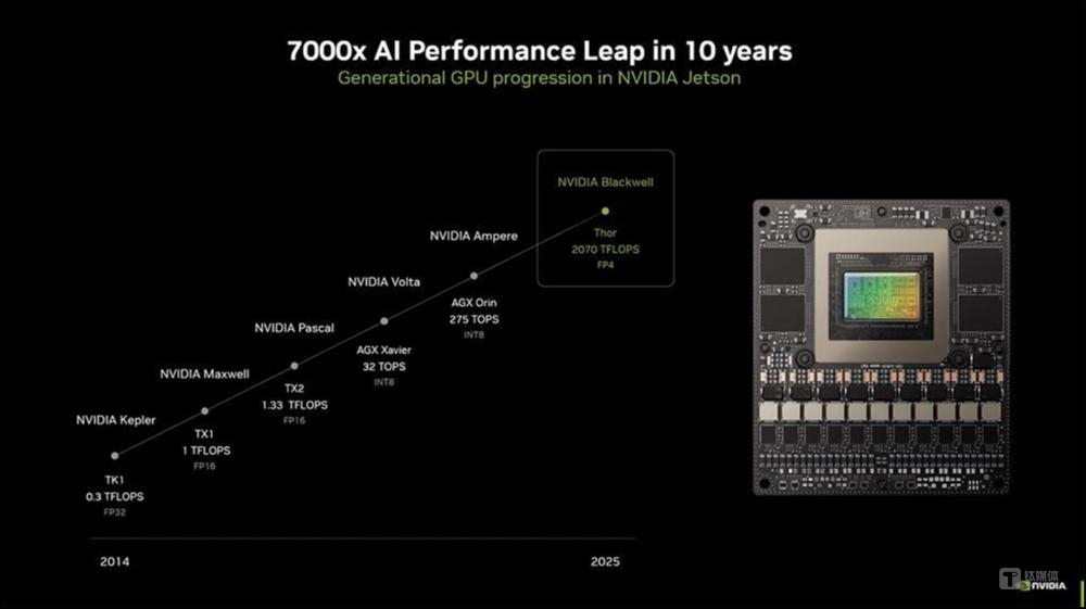 如果10年前相比,Jetson ThorAI性能足足提高多达7000倍。据悉,英伟达首批Jetson Thor芯片已交到银河通用等多家企业手里。