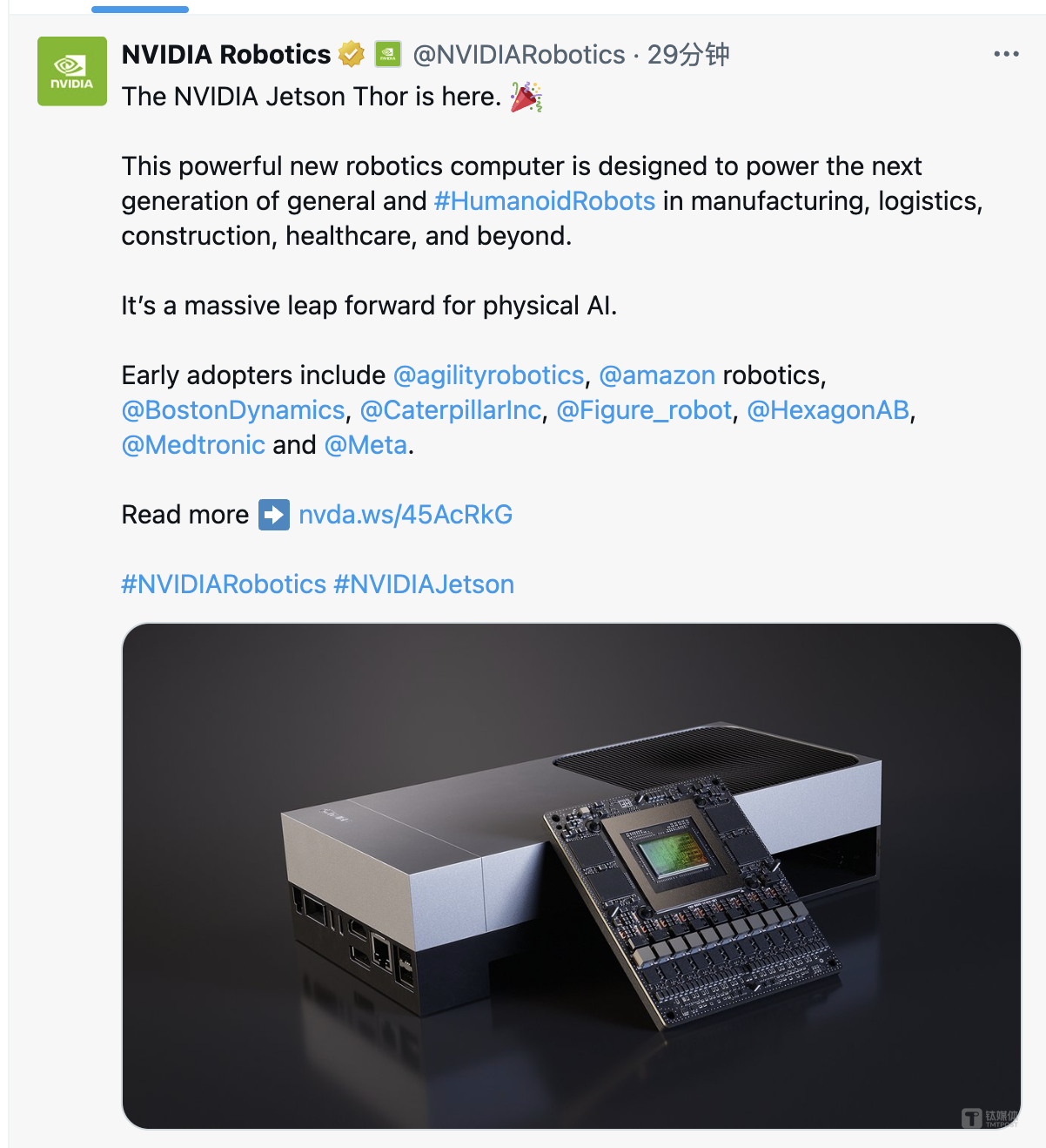 而Jetson Thor也将引爆机器人“新大脑”商机,台积电、鸿海等产业链公司都将受益。